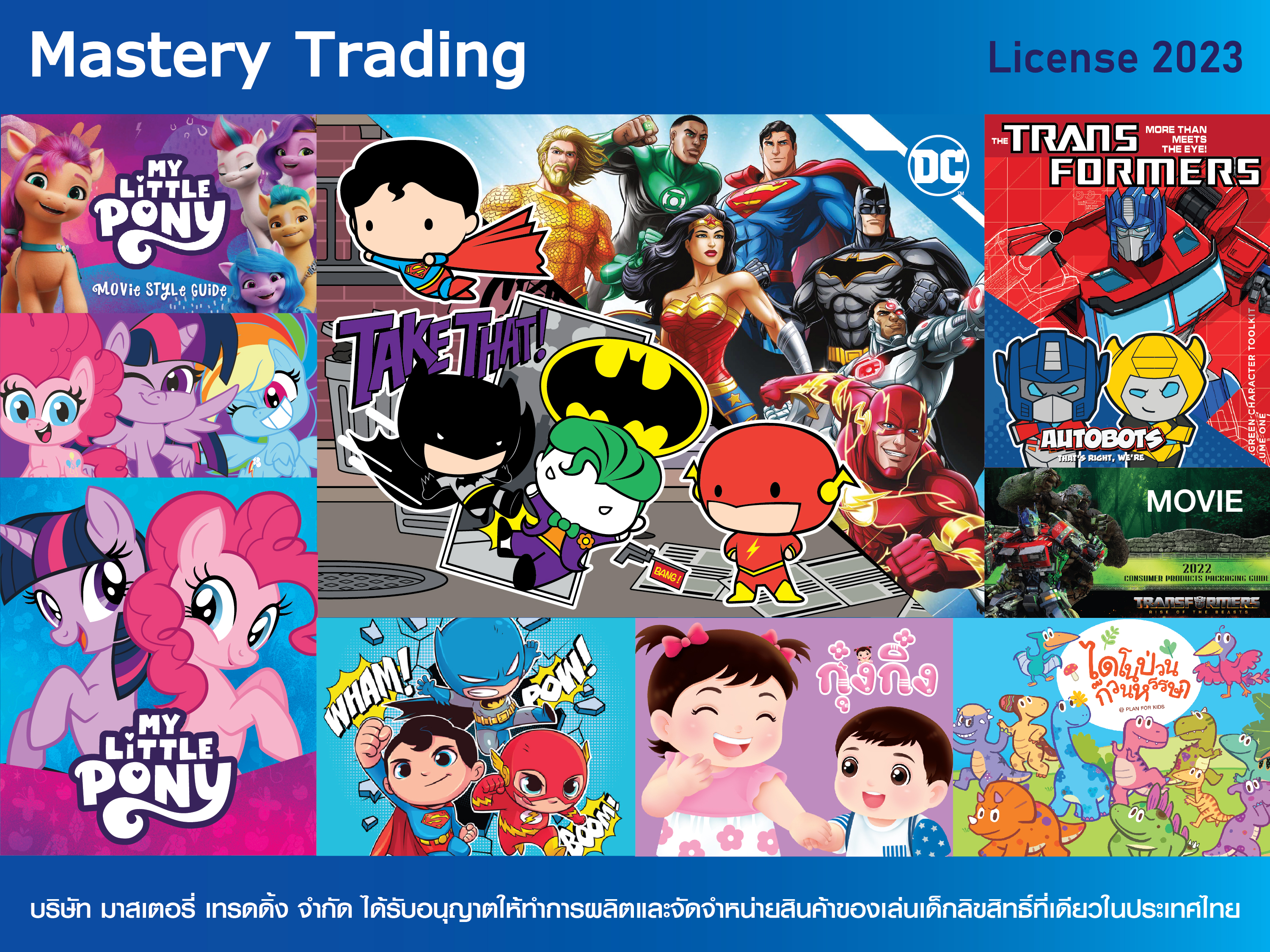 บริษัท มาสเตอรี่เทรดดิ้ง จำกัด บริษัทที่มีประสบการณ์ด้านของเล่นมากว่า 15 ปี และได้รับอนุญาตให้ทำการผลิต นำเข้า จัดจำหน่ายสินค้าของเล่นเด็ก รวมไปถึงของเล่นลิขสิทธิ์แบรนด์ดังและเป็นที่รู้จักทั่วโลก เช่น DCซุปเปอร์ฮีโร่ ทรานส์ฟอร์มเมอร์ส มายลิตเติ้ลโพนี่ นิทานกุ๋งกิ๋ง นิทานไดโนป่วนก๊วนหรรษา ซึ่งลิขสิทธิ์เหล่านี้เราได้รับสิทธแต่เพียงผู้เดียวในประเทศไทย จึงทำให้มั่นใจได้เลยว่า ลูกค้าจะได้รับสินค้าที่มีคุณภาพ และสินค้าลิขสิทธิ์ที่ถูกต้อง “นอกจากนี้เรายังมีสินค้าเสริมพัฒนาการเด็กกว่า 1,000 รายการ”